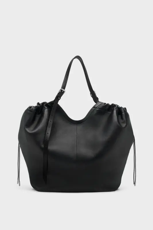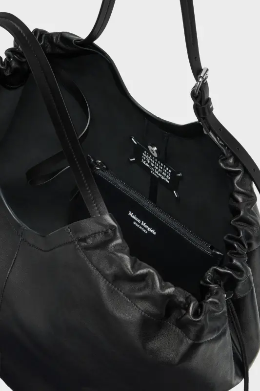 Crafted in soft nappa leather, this oversized shopper merges volume with structure. The gathered top softens its angular form, while belt-inspired leather handles lend a utilitarian edge. A detachable pouch tucks inside, designed for everyday essentials. At the front, the Maison’s signature four stitches appear; the opposite of a label.