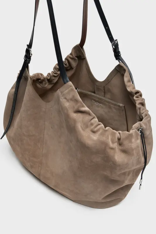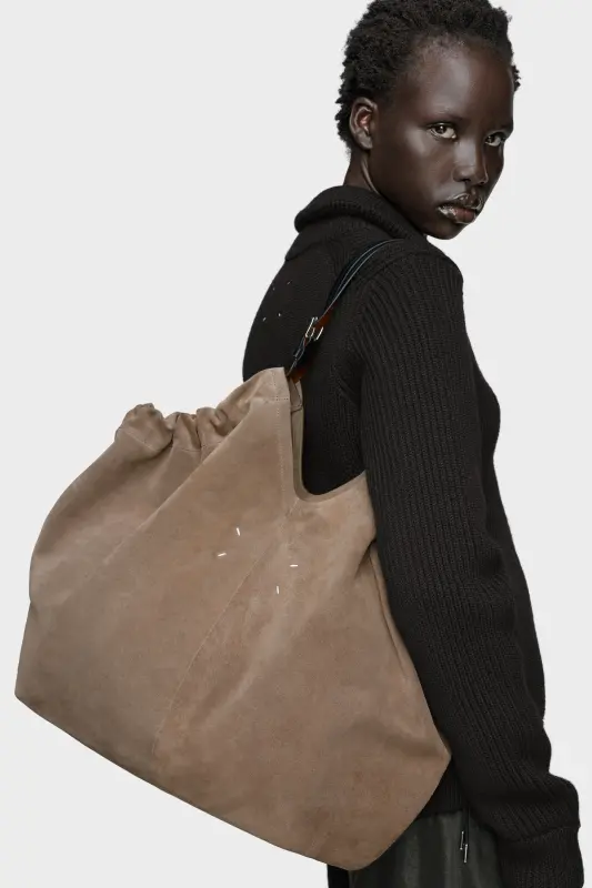 Crafted in supple suede, this oversized shopper merges volume with structure. The gathered top softens its angular form, while belt-inspired leather handles lend a utilitarian edge. A detachable pouch tucks inside, designed for everyday essentials. At the front, the Maison’s signature four stitches appear; the opposite of a label.