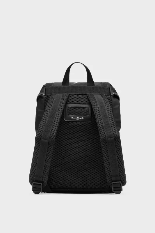 This technical backpack is crafted in structured fabric with mesh panels, silver-tone hardware and adjustable webbed straps. The flap top conceals a drawstring closure, while a padded back ensures comfort in transit. The design is accented with a tonal logo plaque and the Maison’s signature four stitches – the opposite of a label.