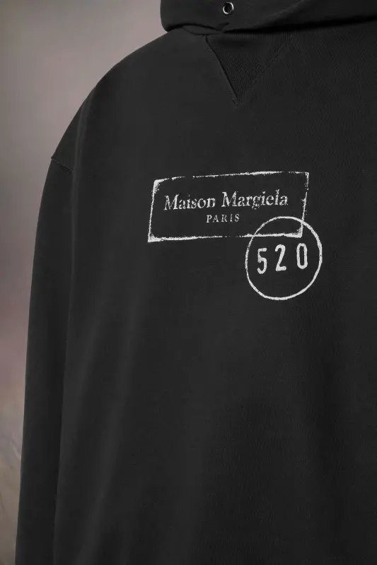 The hooded sweatshirt features a relaxed fit and ribbed trims, elevated by a muted chest motif inspired by archival industrial stamps. Reimagined as a contemporary graphic gesture, it reflects the Maison's conceptual approach. At the back, the four white stitches underscore its signature; the opposite of a label.
