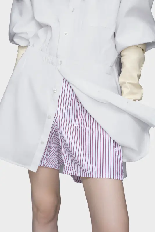 A crisp cotton jumpsuit, cinched at the waist with an elastic band for unexpected shape. Designed with a chest pocket and pointed collar, it reinterprets a classic with quiet subversion. At the back, the Maison’s signature four stitches appear; the opposite of a label.