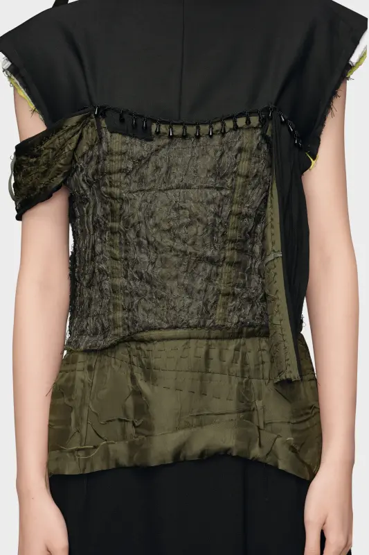 A demonstration of the Maison’s Décortiqué technique, which focuses on the construction of a garment, the dress appears reformed in multiple contrast layers. It is cut just below the knee, with loose threads and distressed elements to indicate a garment that is never finished. It features capped sleeves and a crew-neck, with peak lapels on the reverse to create a low-back shape. Maison Margiela's signature, the four stitches, appear at the back; the opposite of a label.