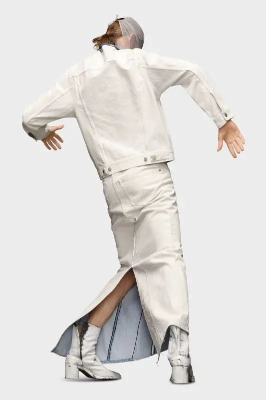 This fitted collarless denim jacket has a cracked white effect and features classic metal hardware and seam detailing. The contrast neck has a raw finish and the back shows the four white stitches, showing the hand of the Maison: the opposite of a label.