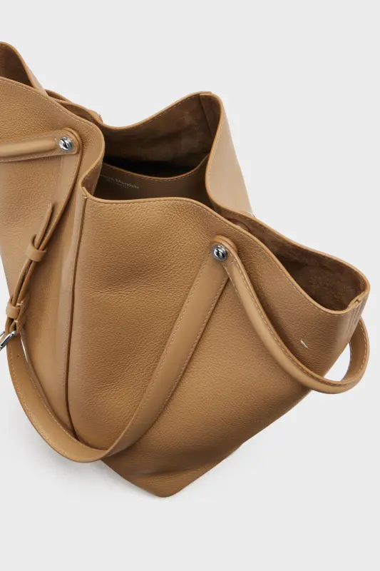 The Maison launches the Dress-age handbag for SS25, crafted from soft pebbled calfskin. With an equestrian spin, the medium handbag features classic leatherwork and refined lines, combining unconscious glamour with gestural design. It follows a trapezoid shape with contrast dual-wear strap detail. The studded base allows the bag to stand, and the inner is adorned with the logo. Maison Margiela's signature, the four stitches, appear at the back; the opposite of a label.