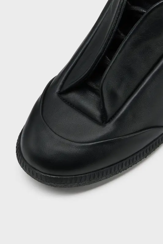 Originally launched in the SS11 collection, the Future sneaker is reintroduced this season. Defined by its seamless construction and concealed fastening. Built without visible laces, a hidden strap folds across the tongue to create a uniform surface, evoking anonymity and restraint. Crafted in soft calfskin, the mid-top silhouette is finished with a tonal sole. Maison Margiela's signature single white stitch appears at the back.​