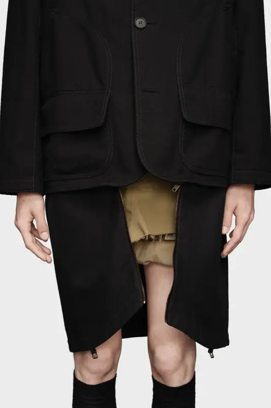 Crafted from heavy cotton with wool sleeves, the coat can be worn in its knee-length design with contrast panel or worn in a jacket silhouette by folding with zips. It has a chest pocket and flap pockets as well as a collar and button fastenings. Maison Margiela's signature, the Four stitches, appear at the back; the opposite of a label.