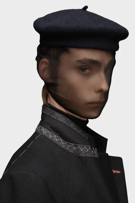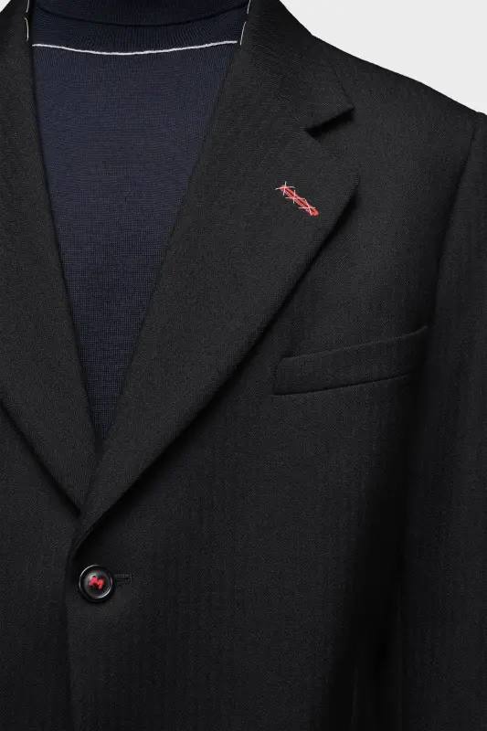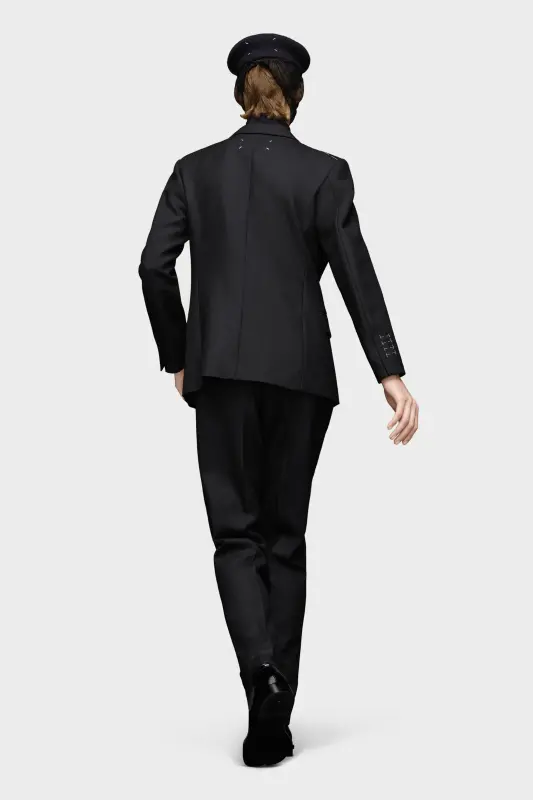 In herringbone wool, the single-breasted jacket features the Maison's work-in-progress stitching on one side of the notched collar. The numeric logo appears inside.