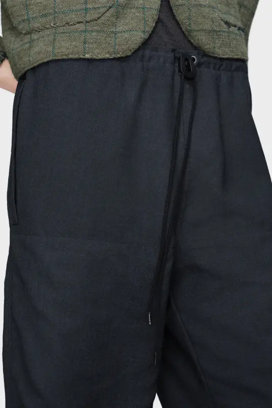 With their gathered cuffs and drawstring waist, these trousers take cues from workwear archetypes, elevated through subversive construction. The layered hem detail adds a sculptural finish, underscoring the Maison’s experimental approach to proportion. Maison Margiela’s signature, the four stitches, appear at the back; the opposite of a label.