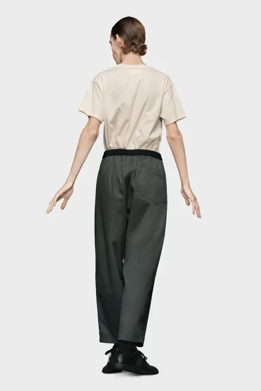 In lightweight cotton, the trousers feature an elasticated waist and relaxed, baggy cut. Maison Margiela’s signature Four stitches appear at the back; the opposite of a label.