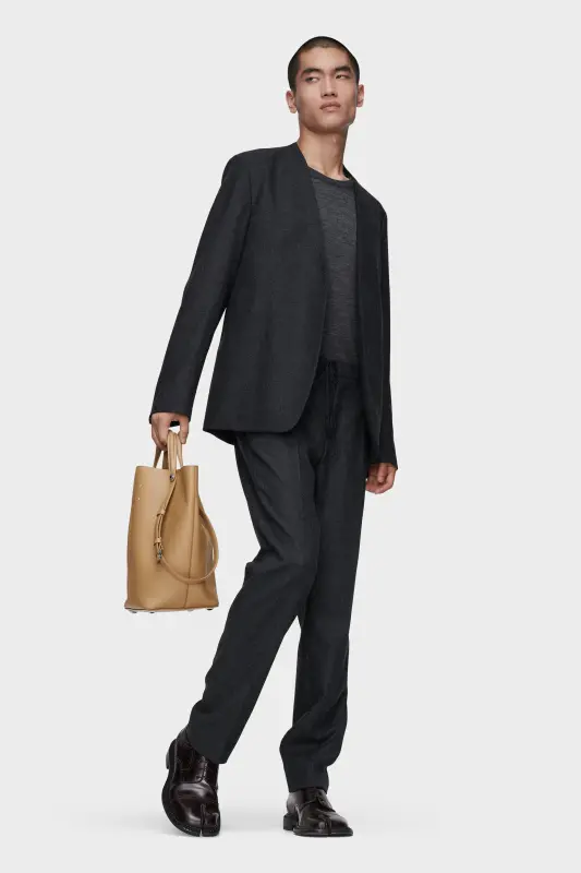 Crafted in virgin wool, this collarless jacket distils tailoring to its essentials. The silhouette is softened through the absence of lapels, creating an uninterrupted front that emphasises proportion and simplicity. A reinterpretation of a classic garment, it speaks to the Maison’s continuous evolution of archetypes. At the back, the Maison’s signature four stitches appear; the opposite of a label.