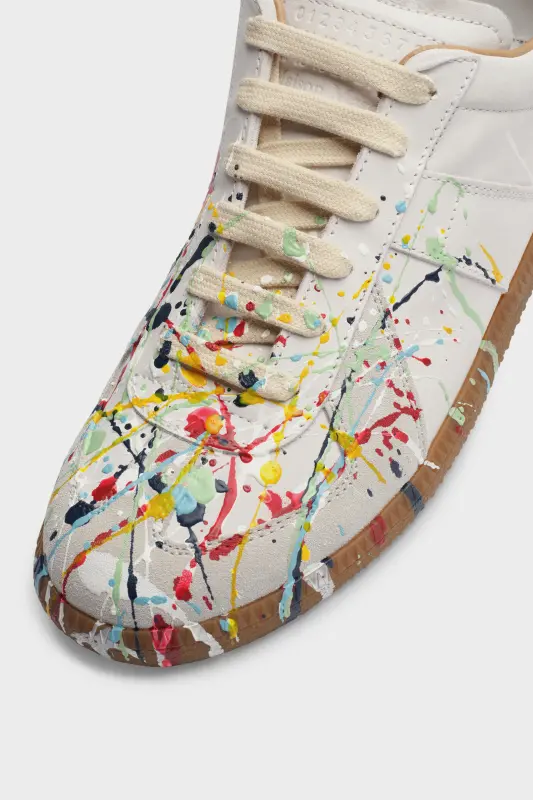 The Replica sneakers in nubuck leather and velour featuring a paint splatter design. The Maison's iconic Replica sneakers are inspired by Austrian sports shoes from the seventies. Details on the Replica pairs are continually reworked in line with the season's inspirations.