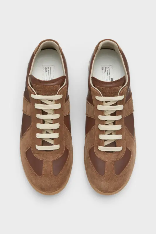 The Replica sneakers in nappa leather and suede with a honey sole. The Maison's iconic Replica sneakers are inspired by Austrian sports shoes from the seventies. Details on the Replica pairs are continually reworked in line with the season's inspirations.