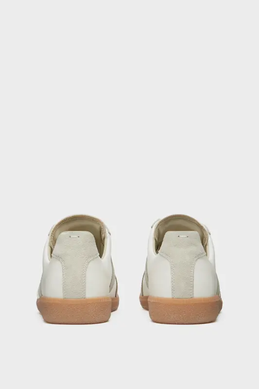 The Replica sneakers in nappa leather and suede with a honey sole. The Maison's iconic Replica sneakers are inspired by Austrian sports shoes from the seventies. Details on the Replica pairs are continually reworked in line with the season's inspirations.