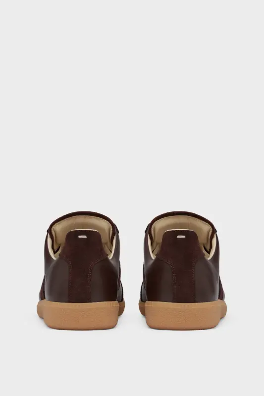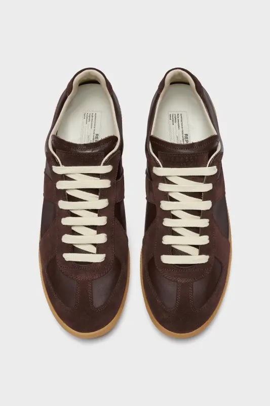 The Replica sneakers in nappa leather and suede with a honey sole. The Maison's iconic Replica sneakers are inspired by Austrian sports shoes from the seventies. Details on the Replica pairs are continually reworked in line with the season's inspirations.