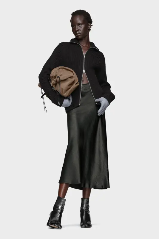 A minimal silhouette in softly crinkled satin. This midi skirt falls with natural ease, its movement guided by a structured waistband and clean lines. At the back, the Maison’s signature four stitches appear; the opposite of a label.