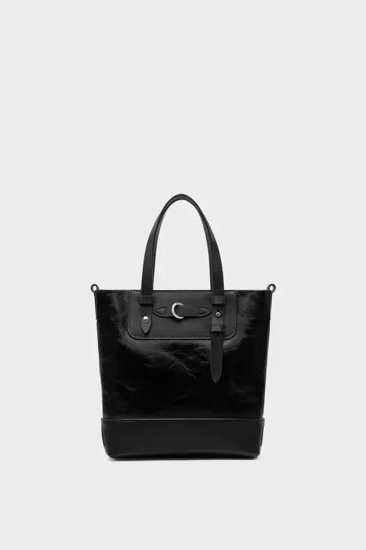 A mini vertical shopping bag in wrinkled glossy leather and calf leather. Belted top handles adjust in length, while a D-ring detail and raw suede lining hint at equestrian design. The Maison’s signature, the four stitches, appear at the front; the opposite of a label.