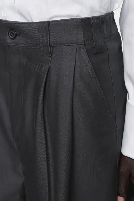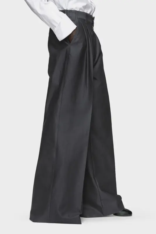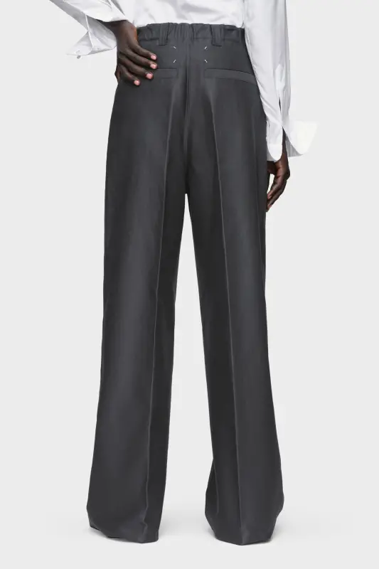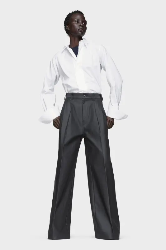 A balance of polish and ease. These high-waisted trousers are cut to an elongated, floor-skimming silhouette with double front pleats and welt pockets. A gathered back waistband lends quiet disruption to the otherwise classic construction. At the back, the Maison’s signature four stitches appear; the opposite of a label.