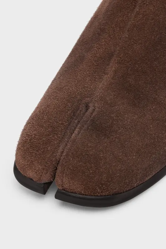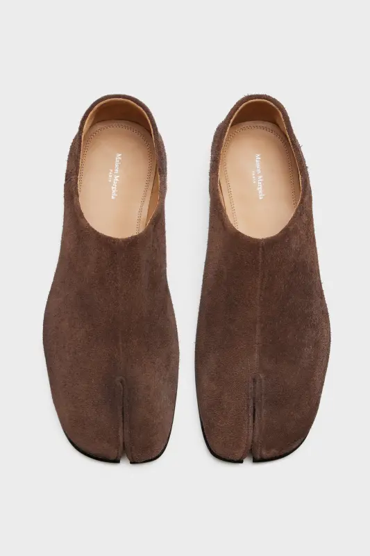 Crafted from suede, the babouche shoes feature the Tabi split-toe. Launched for the Maison's debut collection in 1989, inspired by the traditional 15th century Japanese sock bearing the same name, it captures the avant-garde and insubordinate spirit of the Maison. A heritage classic, continually explored through each collection. Maison Margiela's signature white stitch appears at the back.
