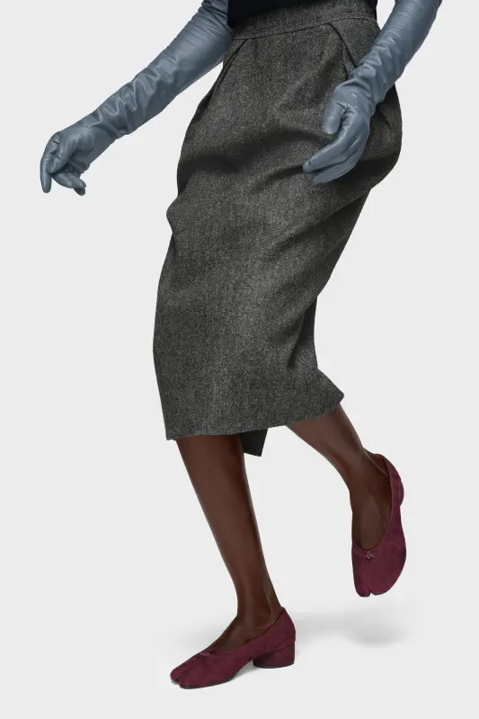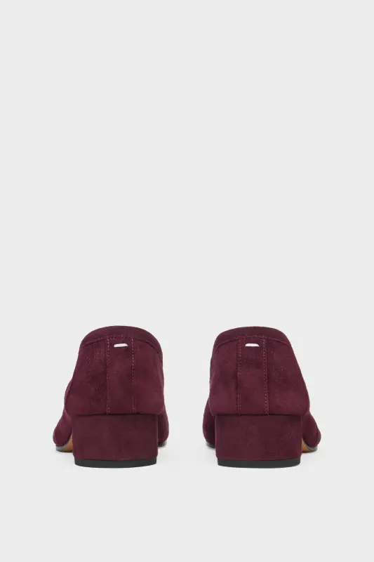 Maison Margiela’s Tabi ballerinas are reimagined in soft suede with a low cylindrical heel. The split-toe shape, inspired by traditional 15th-century Japanese socks, first appeared in the Maison’s 1989 debut and remains a symbol of its boundary-pushing spirit. A knotted front tie refines the finish. At the back, a single white stitch asserts the Maison's identity.