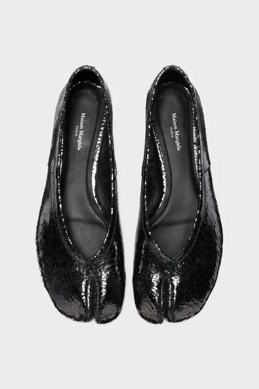 Maison Margiela presents the Tabi new ballerinas, which take their design from ballerina shoes in the house archives. In a broken mirror finish, crafted from leather, the pair feature the Tabi split-toe, inspired by the traditional 15th century Japanese sock bearing the same name – launched for the Maison's debut collection in 1989. It captures the avant-garde and insubordinate spirit of the Maison and exists as a heritage classic, continually explored through each collection.