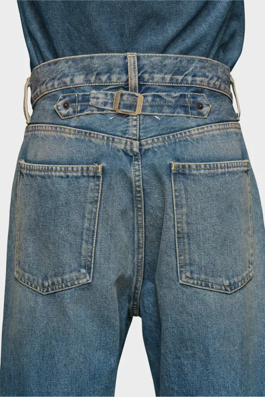 With large turn-ups, the jeans feature five pocket construction and a buckled back for an adjustable fit. Finished with the Margiela hook, belt loops and a button. Maison Margiela's signature, the Four stitches, appear at the back; the opposite of a label.