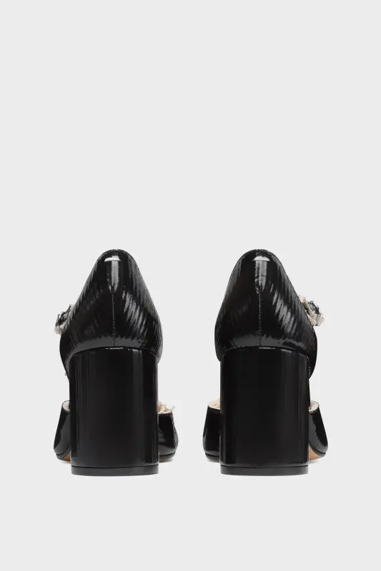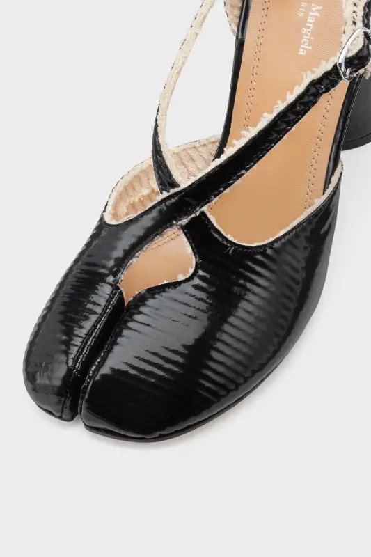 Crafted in high-shine bonded leather, these décolleté heels are detailed with an asymmetrical strap that adds length and definition, while frayed edges subtly nod to the Maison’s deconstructive ethos. They feature the Tabi split-toe, inspired by the traditional 15th century Japanese sock bearing the same name – launched for the Maison's debut collection in 1989. It captures the avant-garde and insubordinate spirit of the Maison and exists as a heritage classic, continually explored through each collection. Maison Margiela's signature single white stitch appears at the back.