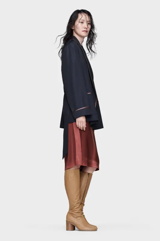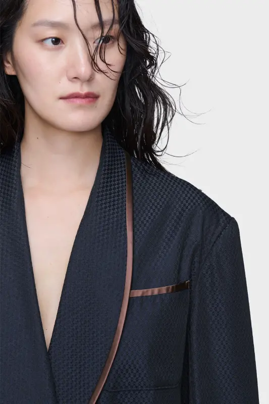This jacket is cut from virgin wool with a tonal jacquard weave, its structure balanced by the softness of a belted waist. The design takes inspiration from the Robe de Chambre, reworking the dressing gown into a tailored silhouette. Satin piping defines the collar, cuffs, and pockets, while a tie closure secures the relaxed line. At the back, the Maison’s signature four stitches appear; the opposite of a label.
