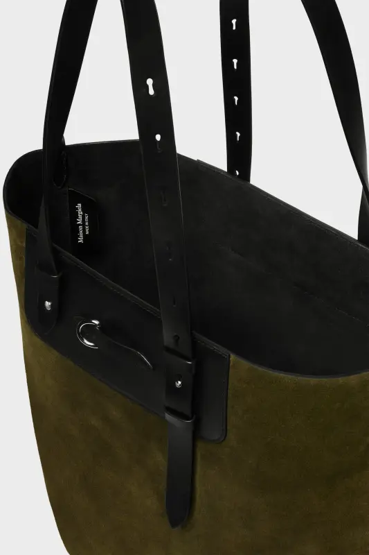 This tote explores the tension between structure and softness, combining a supple body with saddlery-inspired leather straps. Belted top handles adjust in length, while a D-ring detail and raw suede lining hint at equestrian design. The Maison’s signature, the four stitches, appear at the back; the opposite of a label.